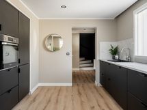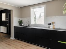 Keittiön varusteet: Jääkaappipakastin, liesi, erillisuuni ja astianpesukone. Liesi: Induktioliesi. Työtason materiaali: Laminaatti.