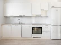 Keittiöstä löytyy mm. erillisuuni, induktioliesitaso, astianpesukone, liesituuletin ja jääkaappipakastin.