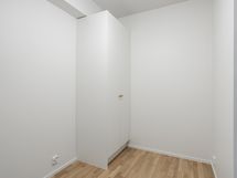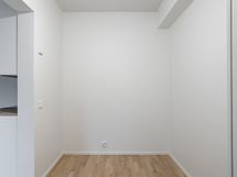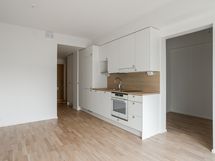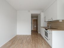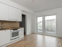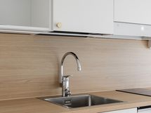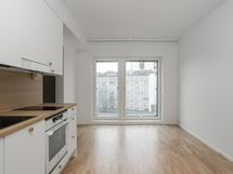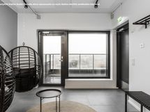Jo hieman tilavampi yksiö, jossa sängylle jää luonteva paikka suojaisaan alkoviin. Keittiön ja olohuoneen yhdistelmään mahtuu ruokapöydän lisäksi pieni sohva. Ikkunasta aukeavat vaikuttavat citynäkymät Tyksin kiinteistöjen suuntaan.