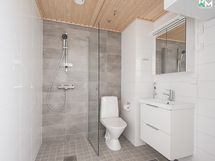- Kylpyhuone, suihku (suihkuseinä), valaisinpeilikaappi, allaslaatikosto, pesukoneliitäntä (tilavaraus pyykinpesukoneelle ja kuivausrummulle), siivouskaappi pyykkikorilla. Lattia: Laatta. Seinät: Laatta