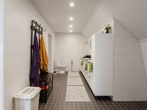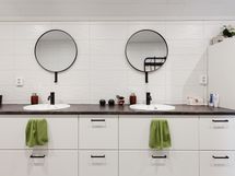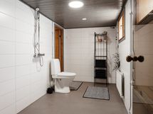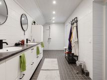 - Yläkerran kaakeloitu kph, suihku, wc, 2 käsiallasta, lattialämmitys. Alakerran kph:ssa 2 suihkua, wc, seinät kaakeloitu, lattia mikrosementtiä. Saunassa sähkökiuas