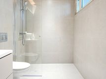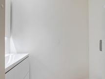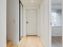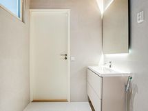 - Pesutilojen kuvaus: Yläkerran pesuhuoneen lattia ja seinät isoa laattaa. Lisäksi suihkuseinä, seinä-wc, valopeili, allaskaappi sekä suihku.