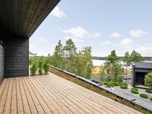 - Etupihalla terassia sisäänkäynnin yhteydessä, ja samoin alakerrassa ns. takaterassi. Molemmista merinäkymät.