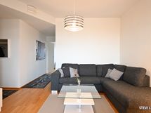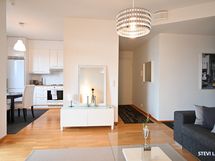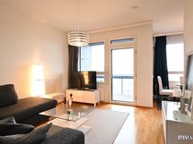 Olohuoneesta, keittiöstä ja parvekkeelta aukeaa komeat kaupunkimaisemat.