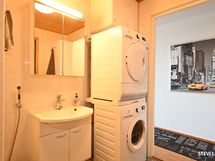 Pesukoneliitäntä on kylpyhuoneessa ja astianpesukone on keittiössä.