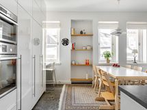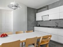 - Kivitasot, Keittiössä on tilaa isolle ruokapöydälle ja reilusti kaappitilaa. Kaksi jääkaappia ja erillinen pakastin, induktioliesi ja integroidut koneet. Keittiöstä käynti piian rappukäytävään ja siivousparvekkeelle sekä ullakolle. Siivousparveke on yhteinen kerroksen toisen asunnon kanssa. Lisäksi asuntoon kuuluu rappukäytävässä oleva pieni kylmäsäilytyskomero.