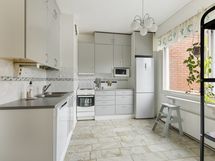 - Keittiön varusteet: Jääkaappipakastin, uuni, liesi, liesituuletin (Epäkunnossa) ja astianpesukone. Liesi: Valurautaliesi. Työtason materiaali: Laminaatti.
