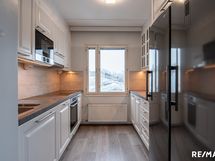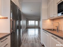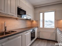 - Keittiön varusteet: Jääkaappi, erillinen pakastin, uuni, liesi, mikroaaltouuni, astianpesukone ja liesituuletin. Liesi: Induktioliesi. Työtason materiaali: Laminaatti.