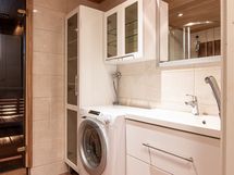 - Pesutilojen varusteet: WC-istuin, suihku, suihkukaappi, pesukone sopimuksen mukaan, pesukoneliitäntä, bidee-suihku, allaskaappi, pesuallas, peili ja lattialämmitys.
