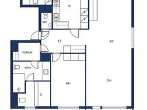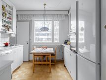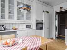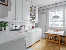- Keittiön varusteet: Jääkaappipakastin, liesi, erillisuuni ja astianpesukone. Liesi: Valurautaliesi. Työtason materiaali: Laminaatti.