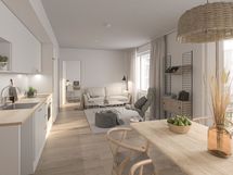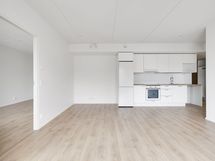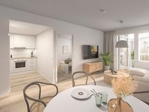 Moderni ja valoisa päätykolmio, joka tarjoaa erinomaisen pohjaratkaisun ja runsaasti luonnonvaloa. Olohuone ja keittiö muodostavat avaran yhtenäisen tilan, josta on käynti lasitetulle parvekkeelle. Keittiössä on laadukas Puustellin kalustus sekä modernit kodinkoneet: induktioliesi, jääkaappipakastin ja tilavaraus astianpesukoneelle ja mikrolle. Asunnossa on kaksi avaraa makuuhuonetta, vaatehuone, moderni kylpyhuone sekä oma sauna kirkkailla lasiseinillä. Kohteeseen on jatkuva haku. Ilmoitus on esimerkki huoneistotyypistä ja hinnat alkaen. Huoneistoluettelo ja hinnasto ovat saatavilla kohteen myyjältä. Sisähavainnekuva on kohteen 3h+kt+s 66m2 asunnosta.