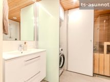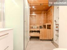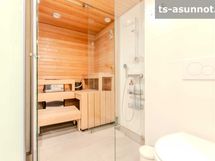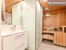 Saunassa on tyylikäs lasiseinä ja vastakkain istuttavat lauteet. Kylpyhuoneessa on tilaa pesutornille. Vesikiertoinen lattialämmitys koko asunnossa tuo asumis- ja sisustamismukavuutta.