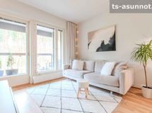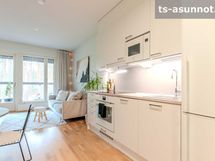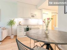 Tämä unelmakaksio on todellakin täydellinen tilaihme. Avaruuden ja valoisuuden aistii heti astuessaan sisään. Vaalea yleisilme ja harmoniset pintamateriaalit korostavat huoneiston raikkautta ja luovat miellyttävää tilan tuntua. Avokeittiössä on tilaa ruokapöydälle.