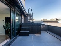 Asuntoon saavutaan suoraan hissillä, joka tunnistaa asukkaan sormenjäljen ja avautuu suoraan eteiseen sekä ylemmän kerroksen kattoterassille. Laaja, lähes 35 neliön terassi tarjoaa henkeäsalpaavat näkymät kaupungin ylle ja on varustettu lämmitettävällä lattialla, sähkömarkiiseilla ja upealla Drop-altaalla – täydellinen paikka rentoutumiseen vuoden ympäri.