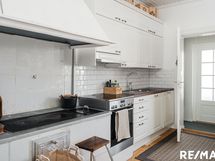 - Keittiön varusteet: Uuni, liesituuletin, astianpesukone, puuhella, jääkaappi, liesi ja mikroaaltouuni. Liesi: Keraaminen liesi. Työtason materiaali: Laminaatti.