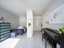 Varustus: pesukoneliitäntä, lattialämmitys, wc-istuin, suihku, peilikaappi, kiinteät valaisimet.