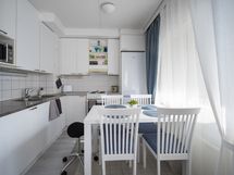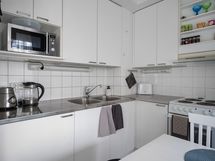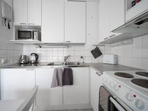 Liesi: sähköliesi. Työtasot: laminaatti. Kylmäsäilytys: jääkaappi/pakastin. Varustus: varattu paikka astianpesukoneelle, liesituuletin / hormi.