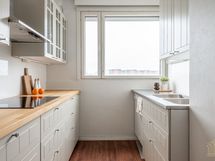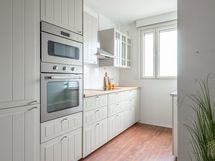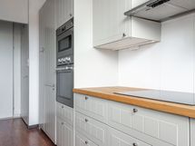 - Keittiön varusteet: Jääkaappipakastin, erillisuuni, liesi, liesituuletin ja astianpesukone. Liesi: Keraaminen liesi. Työtason materiaali: Puu.