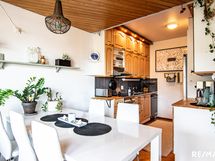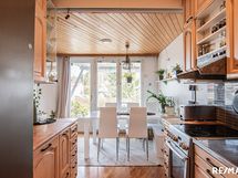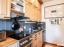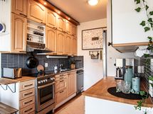 - Keittiön varusteet: Jääkaappi, uuni, liesi, liesituuletin ja astianpesukone. Liesi: Keraaminen liesi. Työtason materiaali: Puu ja rst.