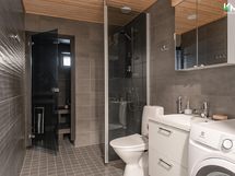 - Kph: suihku, lasisuihkuseinä, allaskaappi, peilikaappi, käsienpesuallas, wc-istuin, bidee-suihku, kiinteät valaisimet, pesukoneliitäntä. Sauna: sähkökiuas.