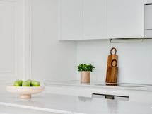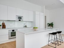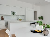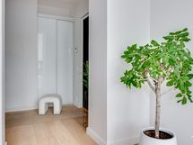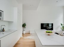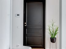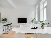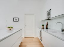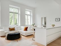Tämä B-portaan toisen kerroksen kaksio sijoittuu Aurakadun puolelle, mutta asuntoa ei liikenteen ääni häiritse. Kodin eteisen jatkeena aukeaa valoisa olohuone ikkunoineen sekä avokeittiö, jossa saareke. Kodin materiaalit ovat laadukkaita ja ajattomia. Lattia on upeaa parkettia ja kaikki kiintokalusteet ja keittiö ovat italialaisen Aran Cucinen sekä integroidut kodinkoneet Gaggenaun. Tunnelman kruunaa lähes neljän metrin huonekorkeus.