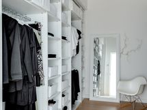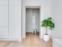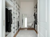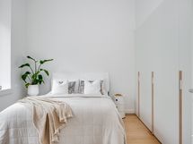 Kodissa on tilavan kokoinen makuuhuone, jonka yhteyteen on toteutettu runsaasti säilytystilaa Aran Cucinen kaapistoin.