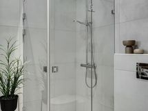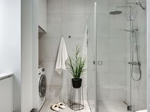 Ylellinen sadesuihkulla varustettu kylpyhuone on suunniteltu spamaisen upeaksi. Kauniit laatat ja kaakelit tulevat Villeroy & Bochin mallistosta. Kylpyhuoneen yhteydessä on tilat myös pyykkihuollolle.