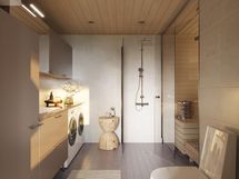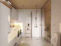 Tunnelmallinen sauna ja kylpyhuone yhdistettynä kodinhoitotilaan tarjoavat miellyttävän paikan rentoutumiseen. Täyslasinen saunan seinä ja integroitu kiuas erillisellä ohjauksella tuovat tilaan tyylikkyyttä ja toimivuutta. Makuuhuoneiden runsaat säilytystilat sekä tilava ulkovarasto varmistavat, että kaikelle löytyy oma paikkansa ja arki pysyy järjestyksessä.