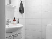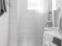 - Kylpyhuone, erillinen wc, suihku, suihkuseinä, peilikaappi, allaskaappi, pesukoneliitäntä, kiinteät valaisimet.