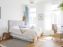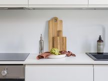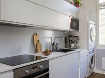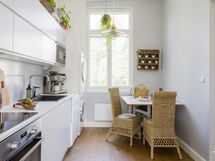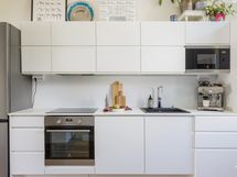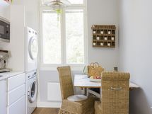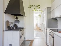 - Varustelu: Jääkaappi (12/2024), induktioliesi, erillisuuni, musta komposiittiallas, integroitu mikro, liesituuletin. Lisäksi keittiössä käyttökuntoinen puuhella ja paikka pesutornille.