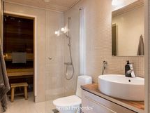 Varusteet: wc, allaslaatikosto, lavuaari, peili, suihkuseinä taittuva (lasi), yksi suihku, sähköinen lattialämmitys, koneellinen ilmanpoisto kylpyhuoneessa (oma säädin). .