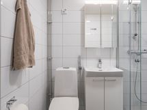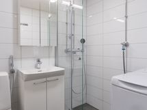 - Pesutilojen varusteet: WC-istuin, suihkuseinä, peilikaappi, pesuallas, allaskaappi ja bidee-suihku. Pesutilojen kuvaus: Pesutilat uusittu LVIS-saneerauksen yhteydessä.