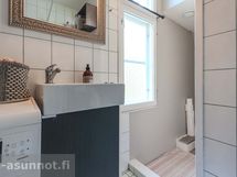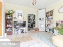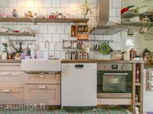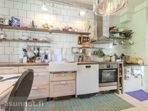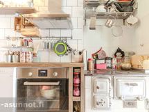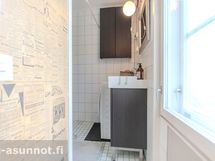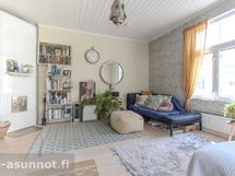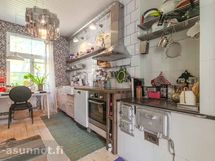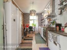 Tämä läpitalon päätyhuoneisto jakautuu kahteen kerrokseen. Ensimmäisessä kerroksessa on iso, valoisa olohuone jossa ikkunat kahteen suuntaan ja kakluuni. Keittiössä on kaikki mitä nykypäivänä halutaan, mutta esille otettu hirsiseinä ja puuhella tuovat alkuperäistä historian havinaa. Kylpyhuoneessa on tilaa myös pesukoneelle. Toisesta kerroksesta löytyy avara makuuhuone jossa lyhtyikkunat.