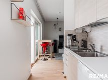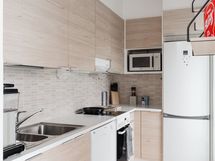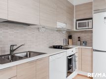 - Keittiön varusteet: Jääkaappipakastin, uuni, liesi, liesituuletin ja astianpesukone. Liesi: Keraaminen liesi. Työtason materiaali: Laminaatti.