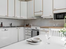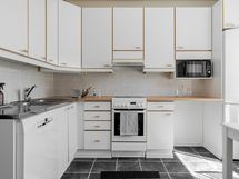 - Liesi: sähköliesi. Työtasot: laminaatti. Kylmäsäilytys: jääkaappi/pakastin. Varustus: astianpesukone.