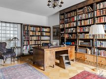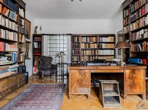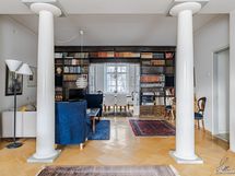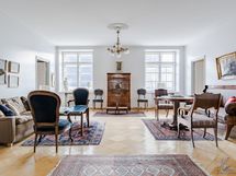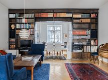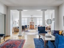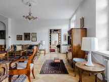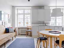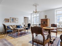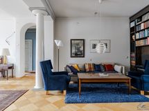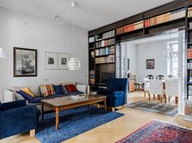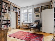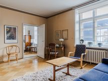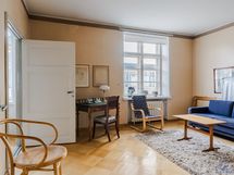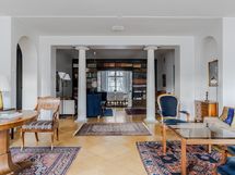 Seinät maalattu, lattia korkkia. Takka vaihdettu 90-luvulla vanhan puuhellan tilalle.