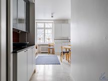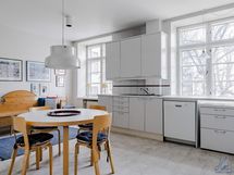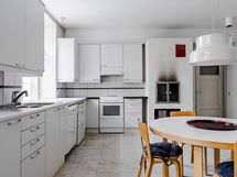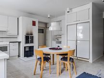 - Vaalea kaapisto. Työtasot kiveä ja melaniinia. Jää-pakastinkaappi, jää-viileäkaappi. Keraaminen liesi, liesituuletin. Astianpesukone.