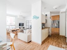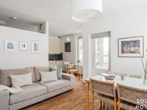 - Osin avokeittiönäkin toimivassa keittiössä on poikkeuksellisen paljon lasku- ja kaappitilaa, erkkeri tuo tilaan kauniin valon.