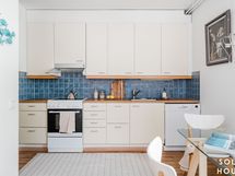 Varustus: keraaminen liesi, talotuuletin, jääkaappipakastin, astianpesukone Materiaalit: lattia laminaattia, seinät maalattu, katto maalattu, välitila laattaa, tasot laminaattia.
