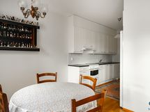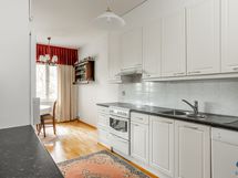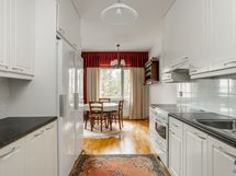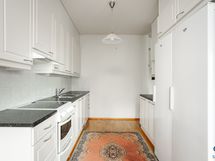 - Korkeat jääkaappi ja pakastin, keraaminen liesi, liesituuletin ja astianpesukone (epäkunnossa). Lattia parkettia ja seinät maalattu.