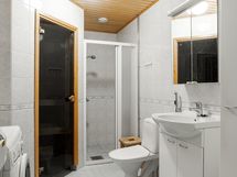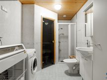 - Pesutilojen kuvaus: Suihku, suihkuseinä, wc-istuin, peili- ja allaskaappi, pesukoneliitäntä ja lattialämmitys. Lattia ja seinät laattaa. Erillisen WC:n kuvaus: 1 kpl. Peili- ja allaskaappi. Lattia laattaa ja seinät maalattu.