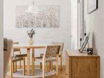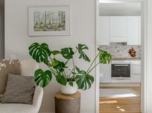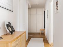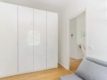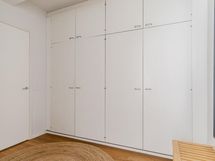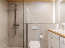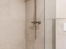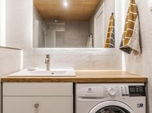 - Kylpyhuone, suihku, suihkuseinä, peilit, peilikaappi, kaapit, allaskaappi, pesukoneliitäntä, lattialämmitys, kiinteät valaisimet.