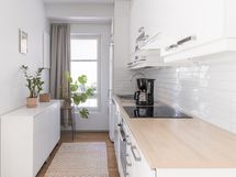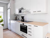 - Keittiön varusteet: Jääkaappipakastin, liesituuletin, astianpesukone ja erillisuuni. Liesi: Keraaminen liesi.