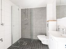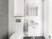 - Pesutilojen varusteet: WC-istuin, suihkuseinä, pesukoneliitäntä, lattialämmitys, peilikaappi, pesuallas, allaskaappi ja bidee-suihku. Pesutilojen kuvaus: Kylpyhuone remontoitu putkiremontin yhteydessä, käyttämätön.
