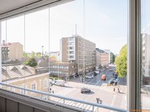 - avarat kaupunkinäkymät, taloja, katu, puustoa, kulmahuoneisto, itä-länsi-pohjoinen suunnassa