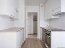 - Keittiön varusteet: Liesituuletin, liesi, jääkaappipakastin ja astianpesukone. Liesi: Induktioliesi. Työtason materiaali: Laminaatti. keittiön kaapistot uusittu 2025.