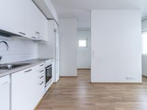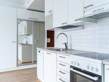 - Keittiön varusteet: Astianpesukone, jääkaappipakastin, liesituuletin ja kiinteät valaisimet. Liesi: Keraaminen liesi. Työtason materiaali: Laminaatti.