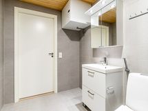 - Pesutilojen varusteet: Suihkuseinä, pesukoneliitäntä, wc-istuin, peilikaappi, suihku, allaskaappi, lattialämmitys ja kiinteät valaisimet. Pesutilojen kuvaus: tilava pesuhuone, paikka pyykkitornille.