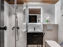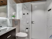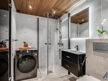- Pesutilojen varusteet: WC-istuin, suihku, suihkuseinä, pesuallas, peili, allaskaappi, bidee-suihku ja pesukone.