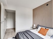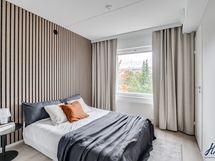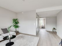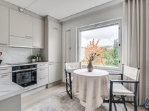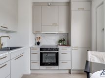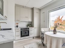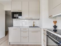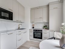 - Keittiön varusteet: Jääkaappipakastin, erillisuuni, liesi, liesituuletin, mikroaaltouuni ja astianpesukone. Liesi: Induktioliesi. Työtason materiaali: Laminaatti. Integroidut kodinkoneet jääkaappipakastin ja astianpesukone.